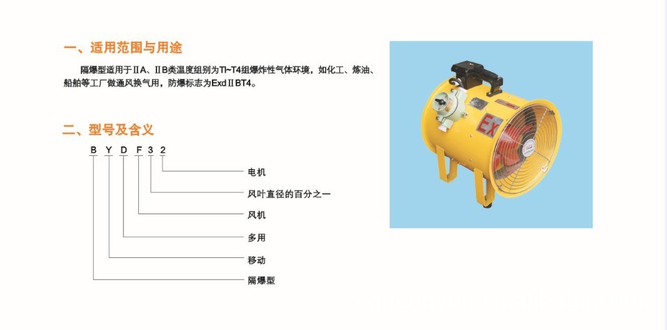 1、隔爆型适用于含有类别为IIA、IIB级温度组别为T1-T4组性气体混合物,划定危险区域为1区、2区的场所,如化工、炼油、船舶等工厂做通风换气用,防爆标志为dIIBT4.