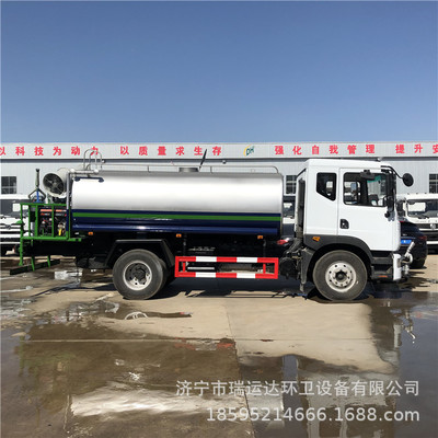 上装配置:罐体容积为12-15立方洒水车,罐体钢板为4.75mm碳钢Q235材质,罐内隔板具有防波作用,以减轻汽车行驶时罐体液体冲击,罐体及整车外形尺寸按照公告。带大功率专用洒水泵,泵可自吸自排,整车前冲、后洒、侧喷、带65消防接口,后平台带绿化洒水炮,洒水炮可旋转,可连续调成直冲状、大雨、小雨、毛毛雨;前封头带水位计,后平台主管路带1寸浇花接口,后爬梯。平台后部带小安全告知牌:“随时停车,注意安全”,带两根水管及阴阳端。罐体颜色:上白/下蓝,银灰/银蓝,罐体两侧喷“洒水车、绿化喷洒车”字样,贴反光标示。洒水车可加装前冲后洒气动阀驾驶室控制、可加装雾炮机组发电机组喷雾降尘装置、车头可加装推雪雪铲、雪滚装置街道、公路除雪等。