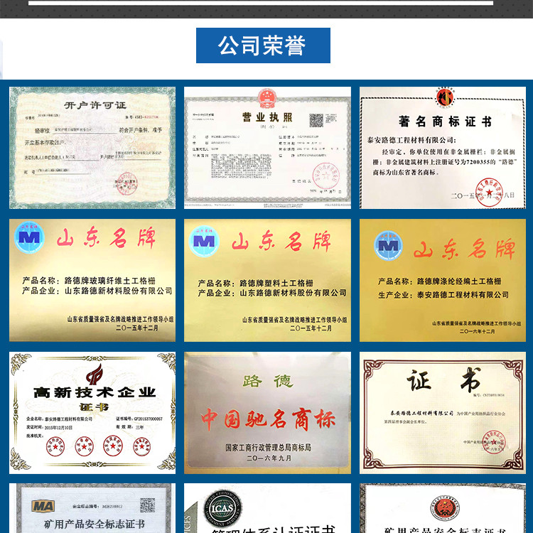 泰安路德工程材料有限公司   主要生产经营:单向土工格栅、双向土工格栅、玻纤土工格栅、经编土工格栅、钢塑土工格栅、矿用土工格栅、凸结点土工格栅、三维土工网垫、高强度土工网、土工格室、工程纤维、塑料盲沟、软式透水管、短纤土工布、长丝土工布、土工膜、复合土工膜、膨润土防水毯等工程材料。