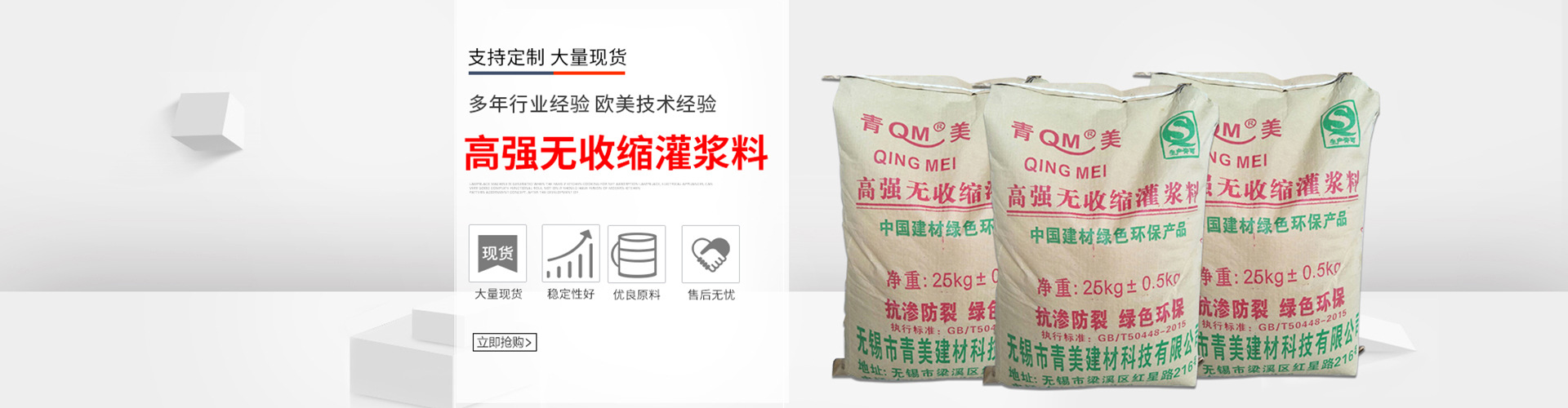 公司自成立以来,遵循以质量求生存,以信誉谋发展的理念,服务于国内外广大建筑行业,装修行业,全力为每一位客户提供好的产品和满意的服务。公司多年来一直与众多科研机构保持着密切的合作关系,在2010年年底与清华大学土木工程学院成立了“干粉建材技术研发平台”,并吸收欧美技术经验,拥有强大的技术支持后盾。成功开发出五大系列、三十多个品牌。即混凝土外加剂系列,粘合剂系列,内外墙腻子粉系列,节能保温系列,防水材料系列。并确保产品质量“环保节能”,符合标准。“青美牌”产品成功遍销长三角地区及国内各地,尤其在江、浙、沪许多大工程中获得了成功的应用和推广。[