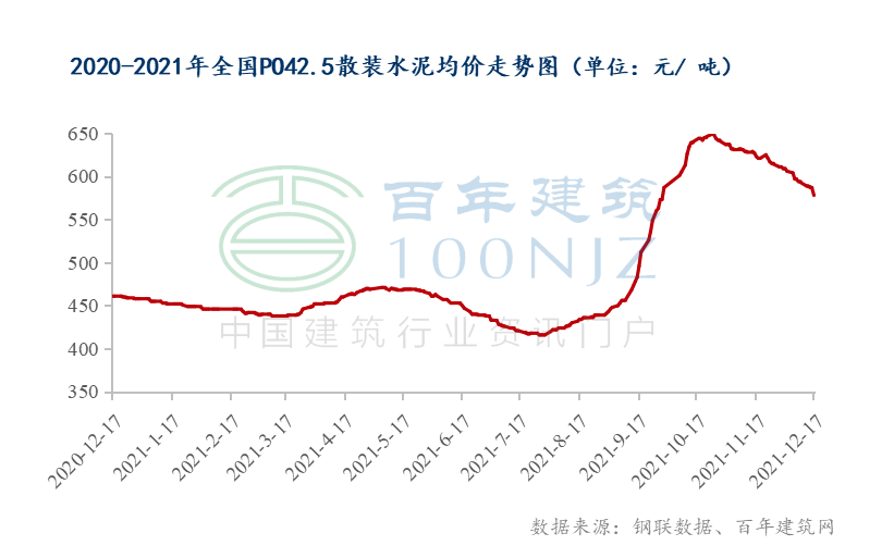 据数据统计,截至12月17日,全国P.O42.5散装水泥均价578元/吨,日环比下跌1.37%,周环比下跌2.53%,预计今日全国水泥价格呈下跌趋势。