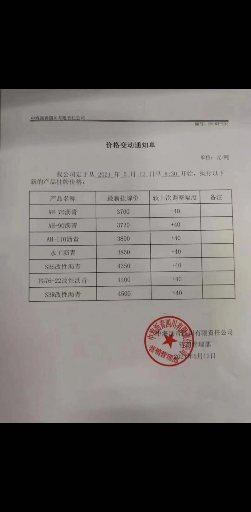核心提示:价格变动通知单