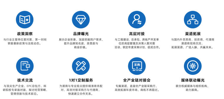 央企及地方总包商参与度高,供采双方对接、采购观展团,特邀EPC工程总承包单位洽谈区内对接。组织以集团为单位的采购观展团。提前登记采购单位拟在建工程项目、工程采购计划需求;提前提供展商展品宣传;现场VIP采购单位宣传册,通过采购方调研反馈,为展商提供更高附加值的专属服务;提前调研采购单位考察供应商意愿,展后按计划有序安排,为展商提供增值服务。
