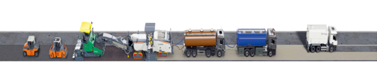 在施工现场,由水泥罐车、水车、沥青罐车、W 380 CR就地冷再生机、福格勒超级2100-3 L摊铺机、悍马320与322单钢轮压路机、HD 138双钢轮压路机、GRW280轮胎式压路机组成的泡沫沥青就地冷再生车队,次序排开,一次性再生整条车道。