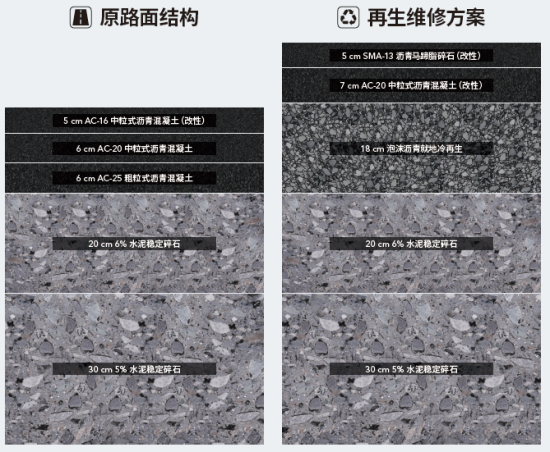 方案实施前,施工方对原有路面进行详细调查,全线路面平整度、抗滑及路面结构强度整体水平处于良及以上水平,但路面车辙及破损状况已处于中级水平。为更好响应国家低碳道路与循环经济的号召,根据破损情况最终决定采用泡沫沥青冷再生技术对道路进行提质修复,改造完毕后哈同高速公路左右两侧标高达到一致。改造方案如下图: