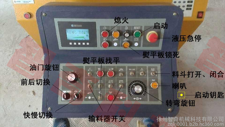 1).前控制面板 熄火按钮、启动按钮、液压急停、熨平板锁死、油门旋钮、快慢切换、左螺旋输料器、右螺旋输料器、熨平板前缸找平、机器转向、喇叭等控制按钮。