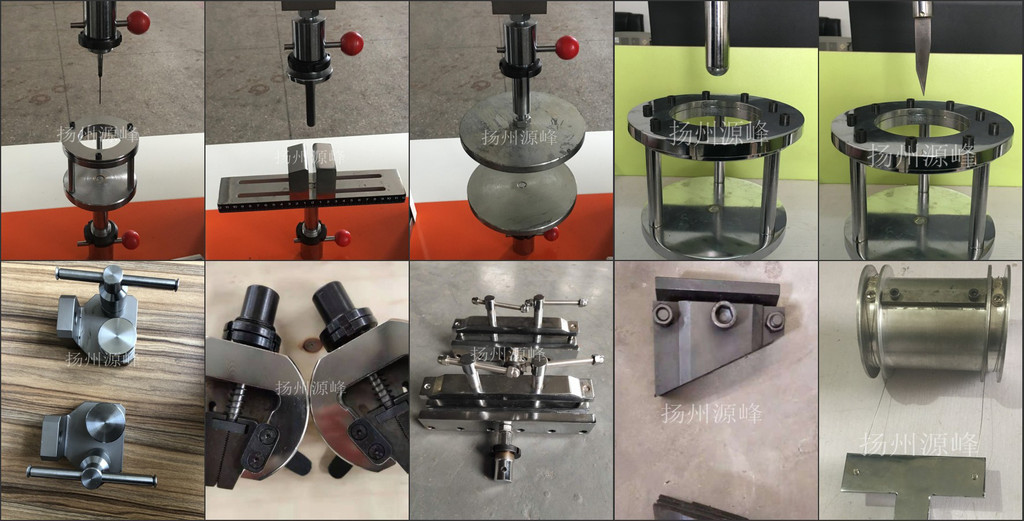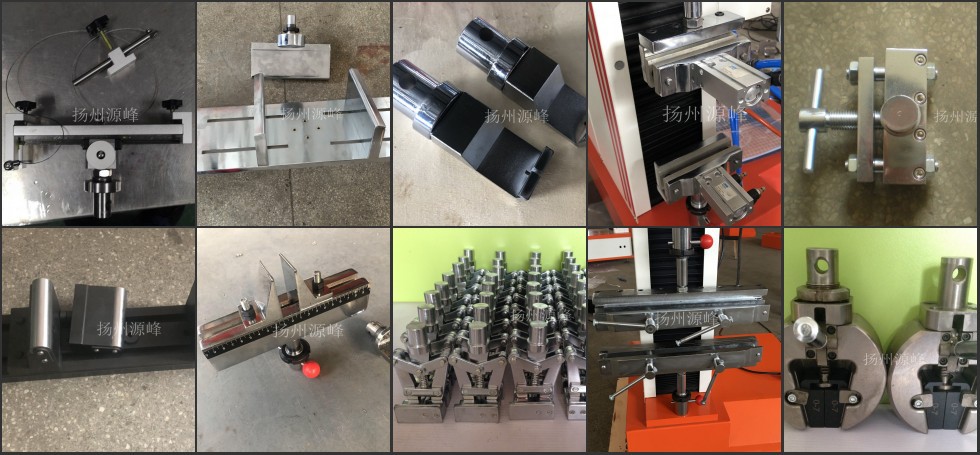 不同材料检测不同产品的夹具工装不同,简言之,夹具工装就是固定试样的那部分,下图为我司部分工装实物图,非标产品可以依据具体产品实物定制,具体需求可联系客服(盗图必究)